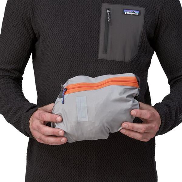 A jaqueta possui fechos de velcro nos punhos do mesmo tecido discreto e pode ser guardada no bolso esquerdo do peito.